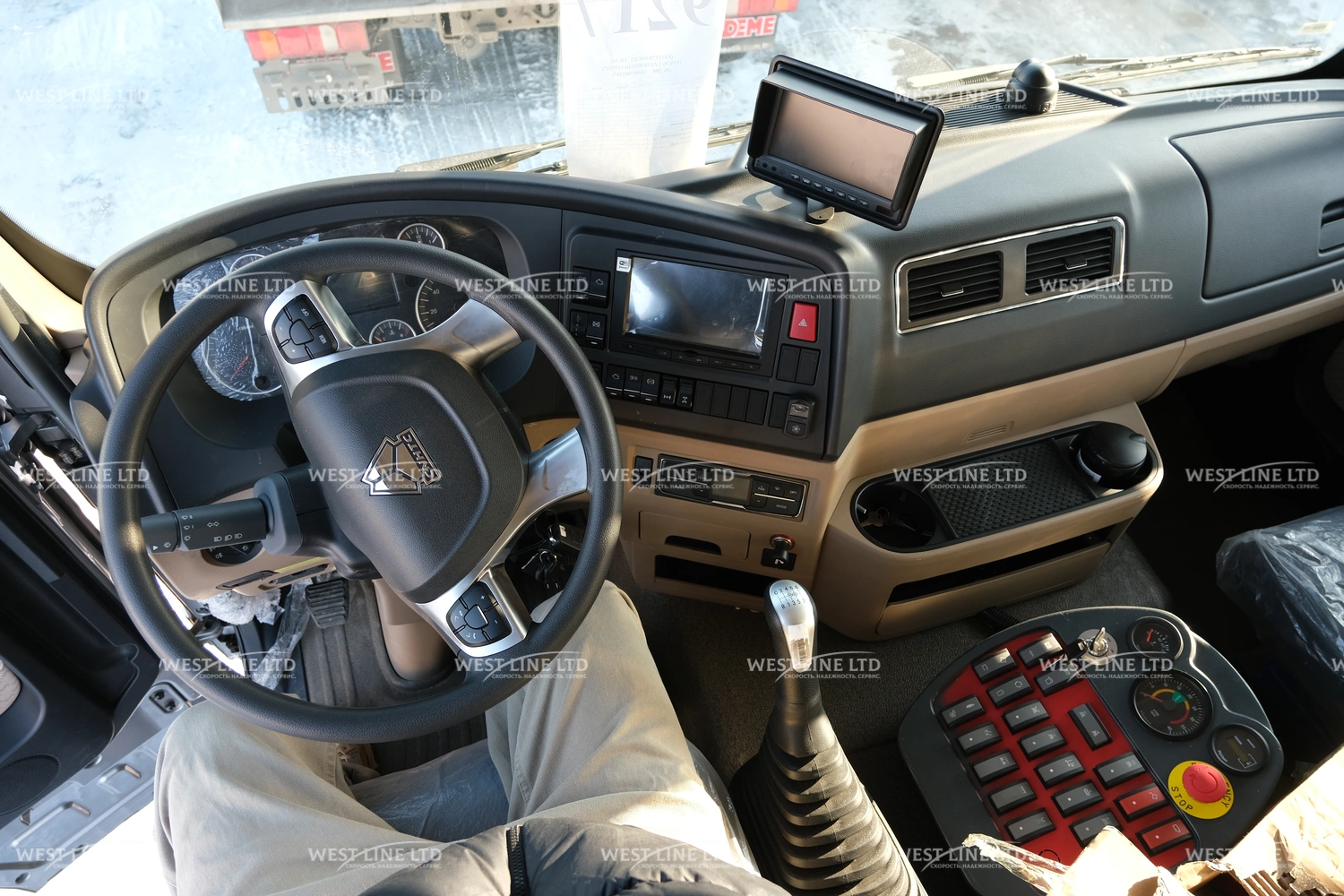 Кабина оснащена всем необходимым для удобной работы водителя кондиционер сиденье с пневмоподвеской регулируемое рулевое колесо камера кругового обзора и эргономичная приборная панель. Всё это повышает комфорт и снижает усталость даже при длительных сменах.